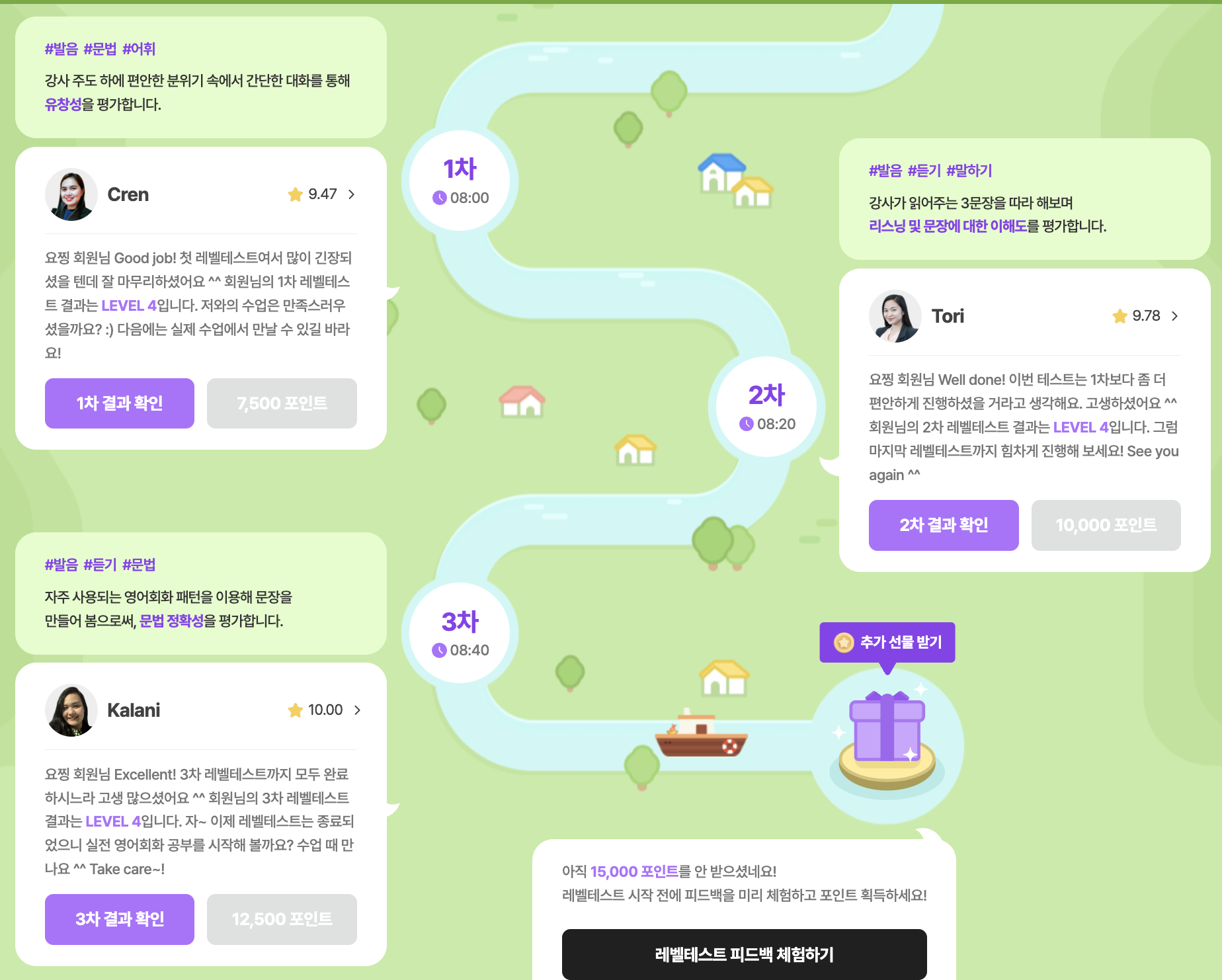 선생님의 피드백과 종합 레벨을 확인할 수 있었습니다.