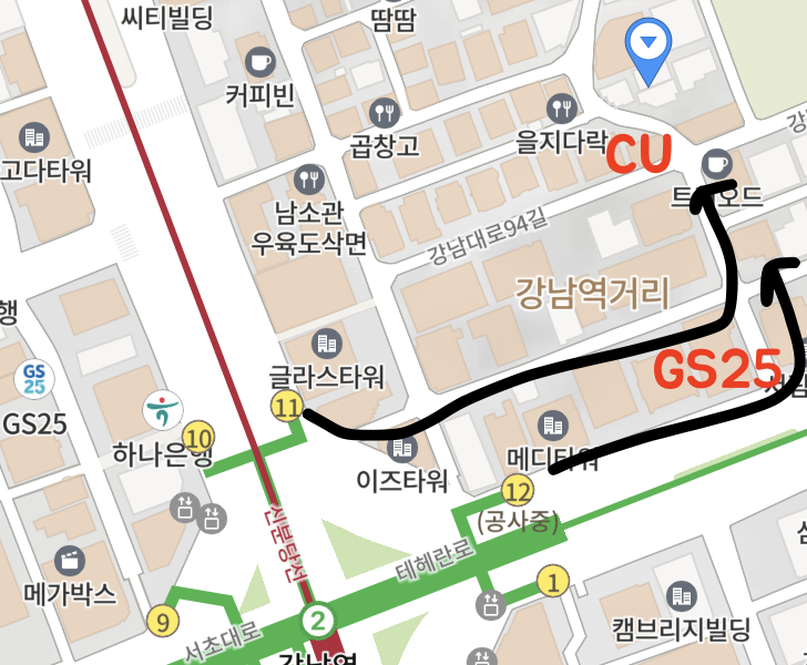 방법은 2가지가 있는데, 강남역 11번 출구에서 가는 방법과 강남역 12번 출구에서 가는 방법이 있다. 글 쓰는 기준으로 2025년까지는 강남역 12번 출구는 공사중이여서 이용할수 없기 때문에 11번 출구를 이용하는 것을 권장한다. 소요 시간은 비슷하다.